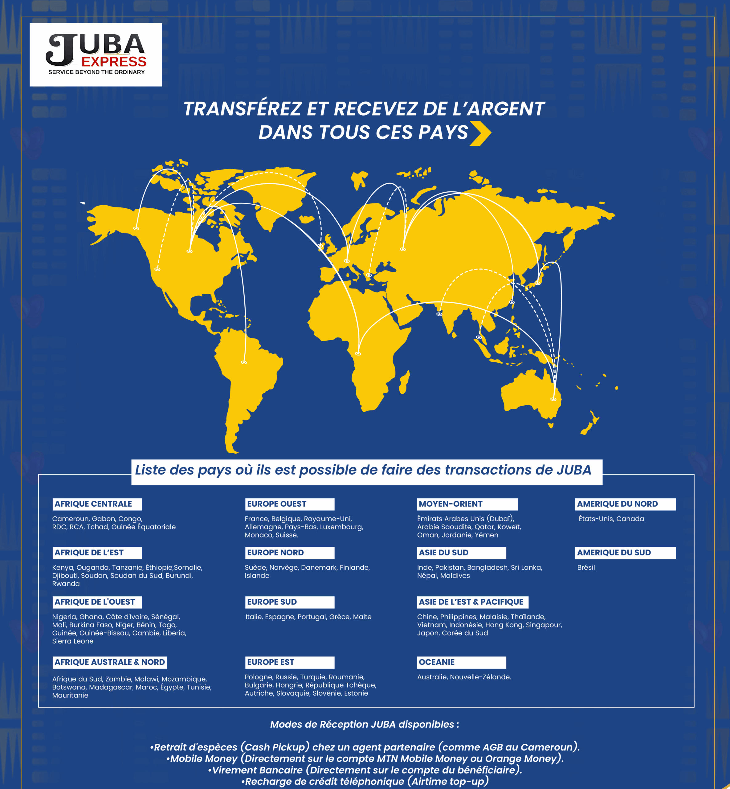 - Opérateurs : il vous donne la possibilité d’envoyer ou de retirer de l’argent de votre compte bancaire à travers différents opérateurs tels que MTN Money, ORANGE Money, Express Union, YOOMEE Cameroun.